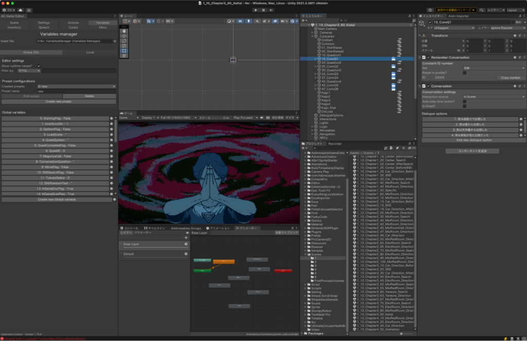 「Adventure Creatorを使えば、アドベンチャー以外のジャンルのゲームもつくれるのではないか」と感じたMOCHIKIN氏は、ゲーム開発にこのアセットを導入することを決断。その判断の根底にあるのは、「どのようなゲームも、開発者側が設定したフラグをプレイヤーが取得することで、ゲーム内で交わされる会話が変化したり、次のシーンへと遷移するシステムである」という考え方です。MOCHIKIN氏は、Adventure Creatorさえ活用すれば、この「フラグの取得と更新」というゲームの基本構造を網羅的に実装できると考え、導入を決めたのです。