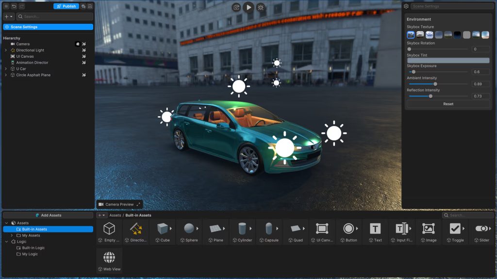 Unity Studioは、ブラウザ上でインタラクティブなリアルタイム3D体験を作成・公開できるノーコードプラットフォームです。複雑な3Dデータのインポート、ビジュアル操作によるシーン構築、ビジュアルスクリプトによるインタラクションの追加、そして最新のブラウザへの公開までを、C#の記述やデスクトップソフトのインストールなしで行えます。 Unity Studioにより、従来のゲームエンジン開発のワークフローを使わなくても、専門分野の担当者やデザイナー、プロダクトチームがインタラクティブな3Dアプリケーションを作成できるようになります。 -
